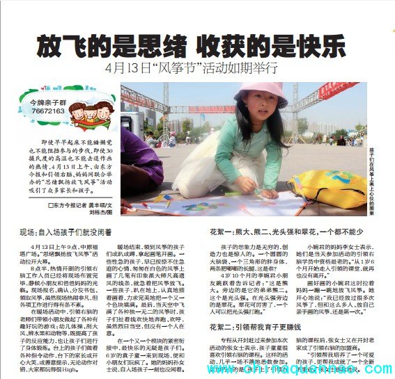 即使早早起床不能睡懶覺也不能阻擋參與的步伐,即使30攝氏度的高溫也不能擊退作畫的熱情,4月13日上午,由東方今報和引領右腦、媽媽網聯合舉辦的“思緒飄揚放飛風箏”活動吸引了眾多家長和孩子。